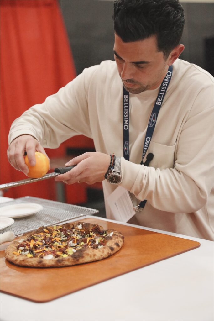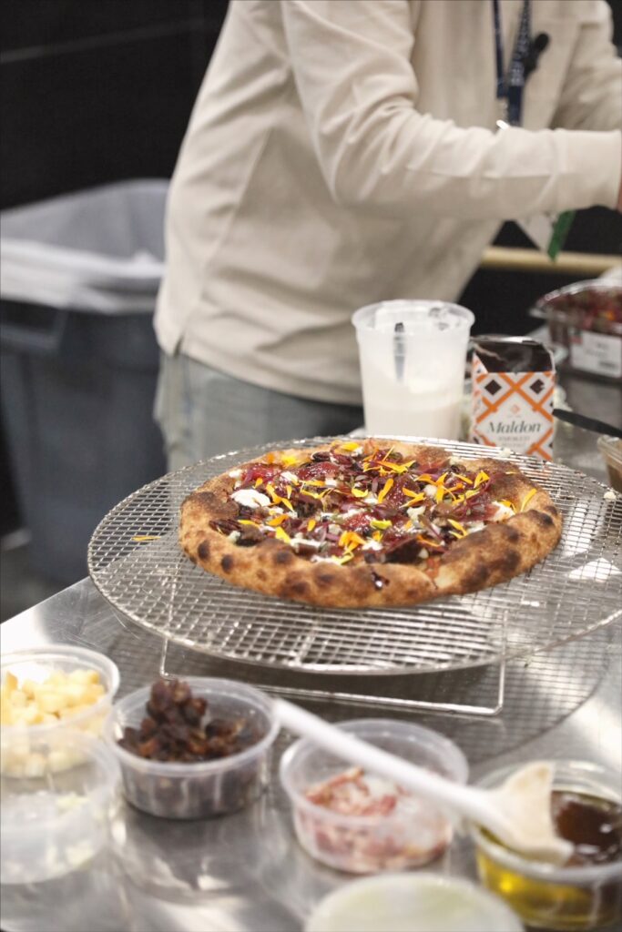 Vakneen’s winning pizza is topped with onion and date jam, maple glazed lardons and duck prosciutto from Tempesta Chicago, Grand Cheese Co. smoked mozzarella, Coachella valley dates, Point Reyes blue cheese, Stracciatella, fried and caramelized pecans, orange zest, microgreens, and edible flowers.