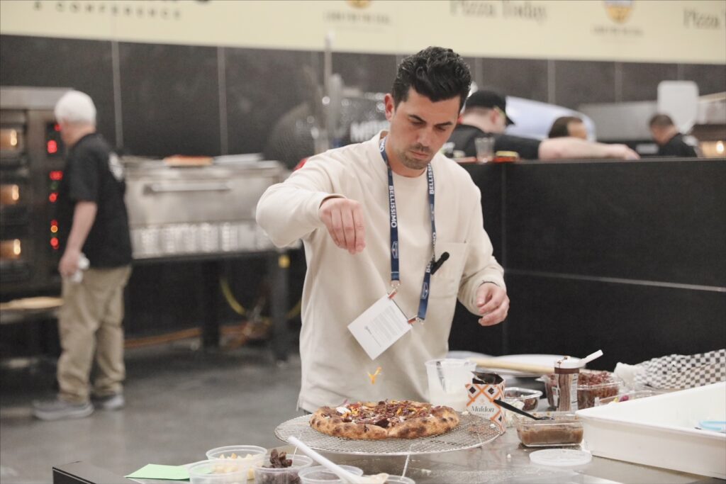 LAS VEGAS – Michael Vakneen, chef and pizzaiolo of Pop Up Pizza at the Plaza Hotel & Casino won first place in the southwest region of the U.S. and second in the world in the non-traditional professional division at the International Pizza Challenge during Pizza Expo 2023 for his “Pork Belly and Date Jam” pizza on a 72 hour fermented sourdough crust that is mixed and finished by hand.