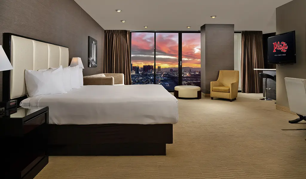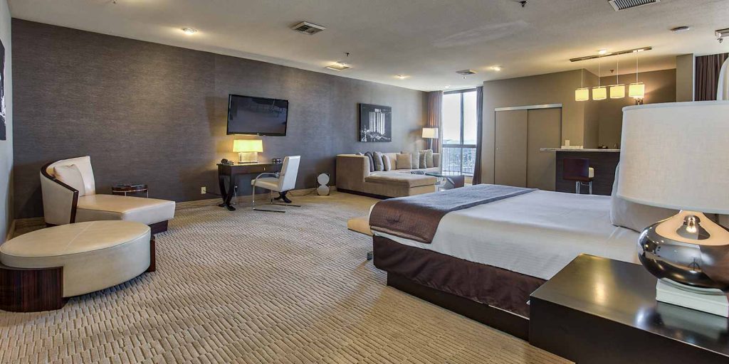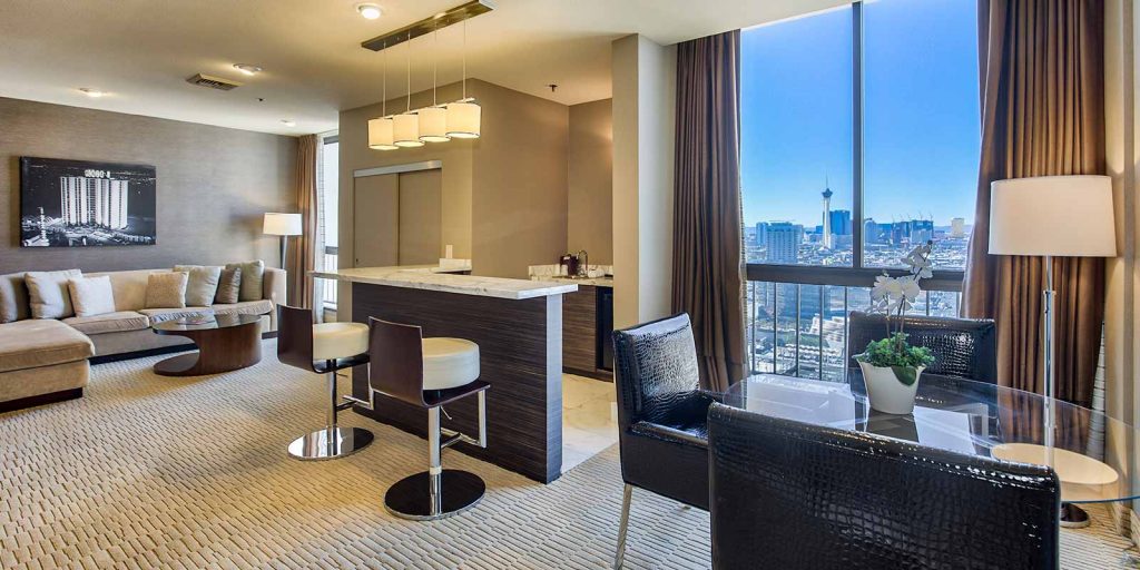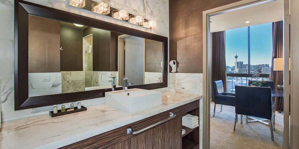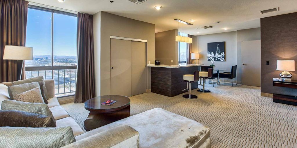 Located on the top floor with Las Vegas skyline views (approximately 945 square feet), each loft-style suite features a spa-style marble bathroom with a hot tub, bar refrigerator, 42” flat screen television with premium cable channels, in-room safe, coffee maker and deluxe room amenities.